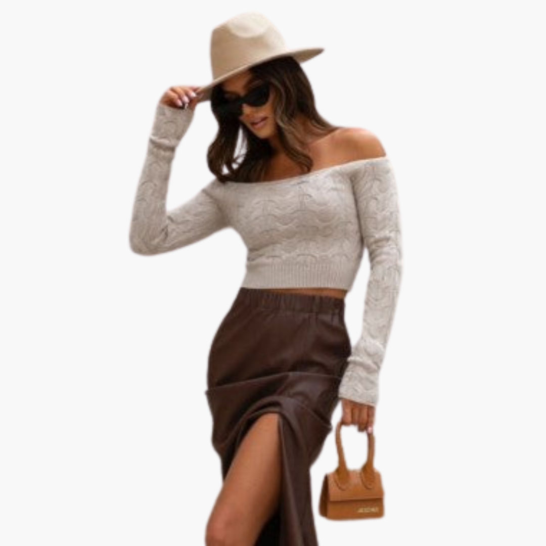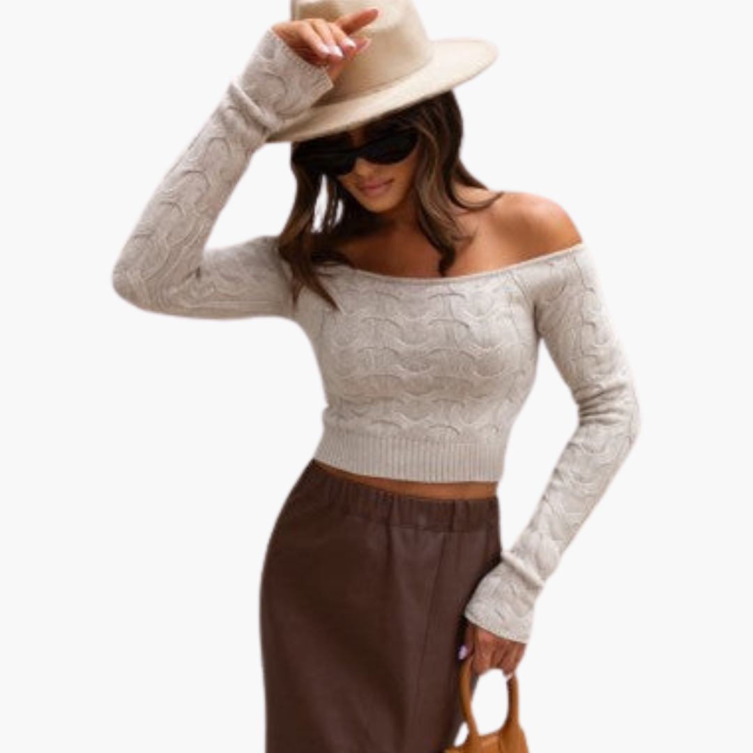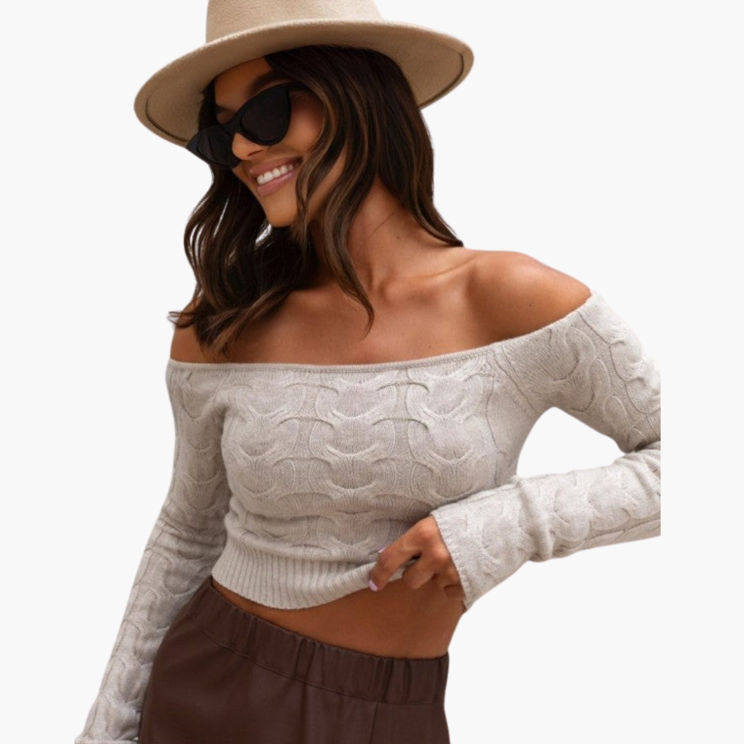 This women's off-shoulder blouse is made from knit fabric and has long sleeves with ribbed detailing at the hem. The cropped length highlights the waist, while the off-shoulder design exposes the neckline. Suitable for everyday outfits with a simple silhouette.